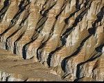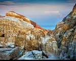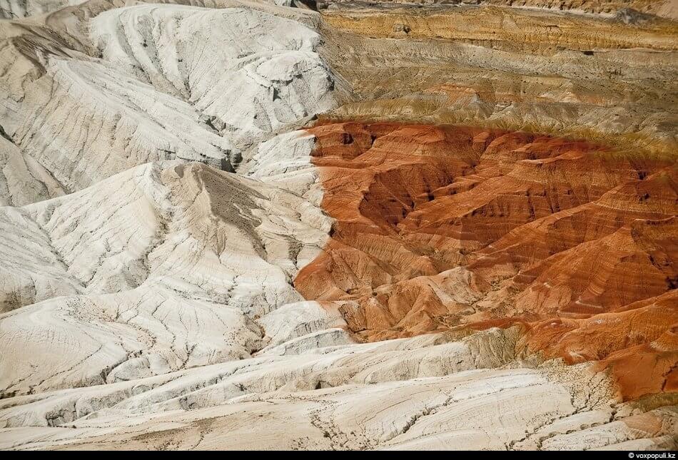 Mountain Ak Tau also located in the national park. Volcanic formations resemble a lunar landscape in the desert. Mountains are made up of layers of white and red.