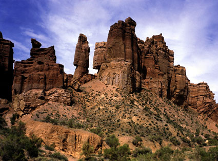 The area around the canyon, looks like unexplored wilderness, because everywhere growing poplars, tamarisk and reeds. Near the river, wind and water brings to everyone here, cool air of the mountains. Here in the valley of the river Charyn canyon nearby, exist the famous grove of ash tree, which occupies the territory of more than 200 km. It took a tremendous amount of time, replaced the era, disappeared the old and new plants and animals, and only ash tree grove remained the same, as well as dozens of centuries ago.
