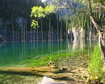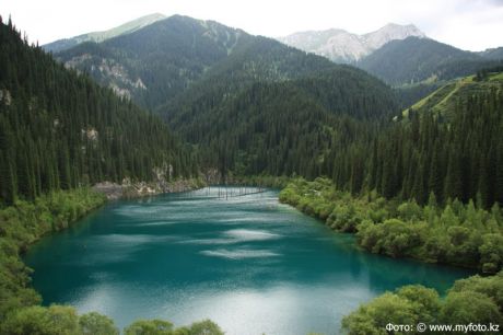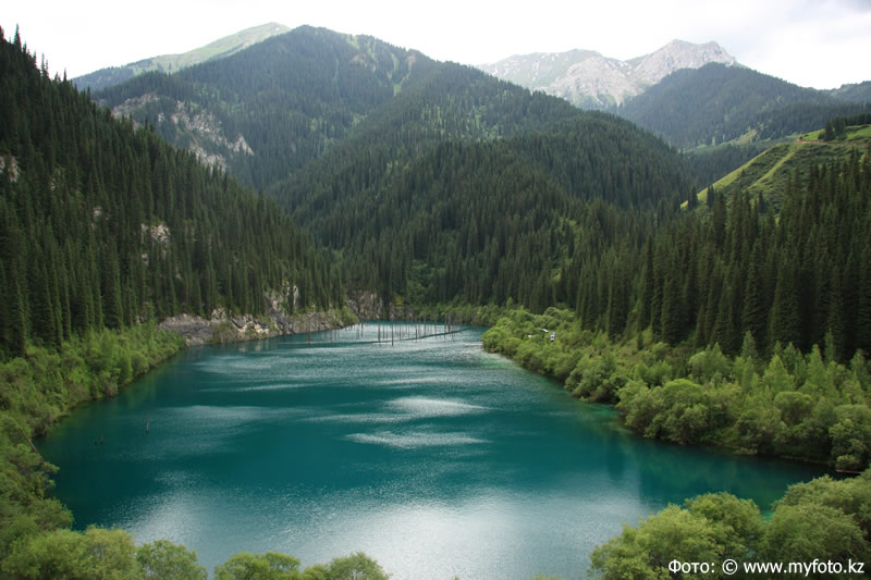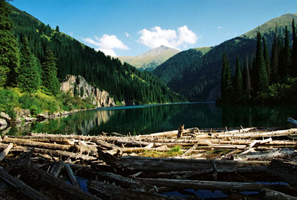Озеро Каинды – поистине удивительный пример творения природы. Располагается оно среди огромного хвойного леса на высоте более 2000 тыс. метров над уровнем моря. Оно было образовано путем оползня громадного скопления известняка, а также просадки грунта. Озеро имеет достаточно большие размеры и весьма полноводное: в самых глубоких местах более 30 метров. Когда – то на его месте росли деревья, сейчас они находятся посреди самого озера, придавая ему и без того необычайный вид.