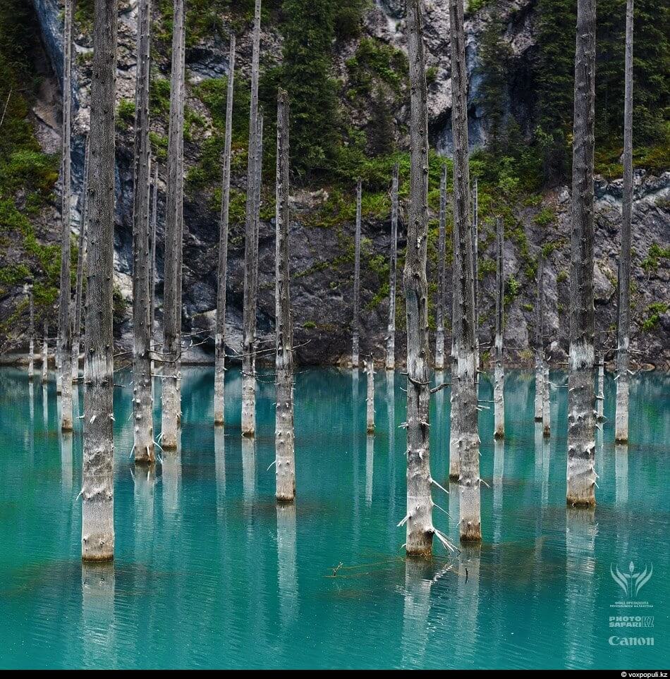 С течением времени водная стихия затопила ущелье, сделав, таким образом, настоящие ворота в самом центре озера. Изюминкой придающей озеру Каинды экзотичности стали хвойные деревья, которых затопить до конца природной стихии так и не удалось. Верхушки хвой удивительным образом возвышаются над водной гладью чудного озера.